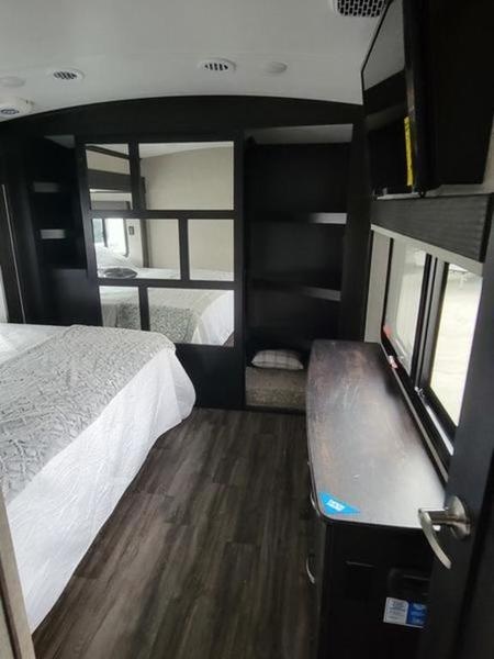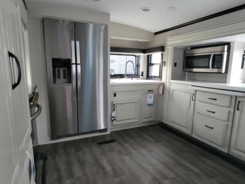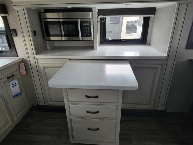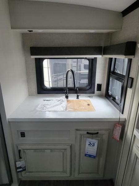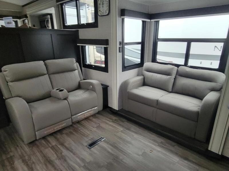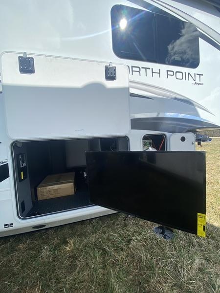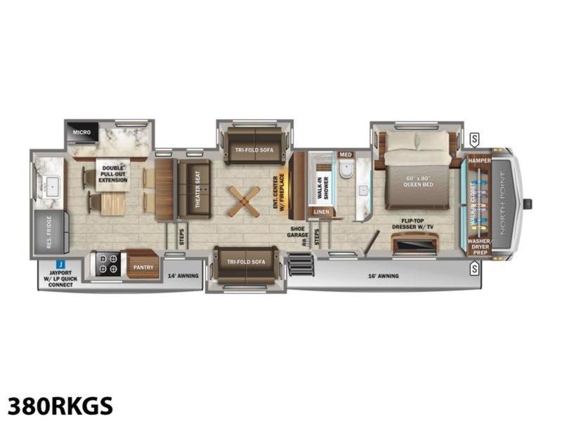 2023 Jayco North Point 380RKGS It’s the little things in this full-profile fifth wheel that you won’t find in others at the same price point. Like the new wooden pull-out spice rack and door with strut above the microwave. A new 24”x24” butcher block in the kitchen that flips up as a countertop extension and new 4K Smart TVs are just a few of the small details given attention in the 2023 North Point. Enjoy three-way adjustable headrests on theatre seats and a new pop-up charger with built-in wireless charger in the dining area for even more convenience and added comfort. Features may include: Exterior 12 in. structural steel I-beam with 10 in. steel drop frame Stronghold VBL™ aluminum framed and vacuum bond laminated gelcoated fiberglass exterior walls (including rear wall and slide room end walls) Magnum Truss™ XL6™ Roof System (strongest tested roof in the industry) with one-piece, seamless roof material with a 20 year warranty Climate Shield™ zero-degree tested weather protection: Fully-enclosed and heated underbelly (ducted) 40,000 BTU output furnace Double layer fiberglass batt insulation (roof and floor) PEX plumbing, 2 in. block foam and reflective foil JaySMART™ (Safety Markers And Reverse Travel) LED lighting (patented) Painted fiberglass front cap with double clear coat and built-in specialty LED lighting Frameless, dark tinted, safety-glass windows Custom automotive-grade vinyl exterior graphics package Skirt metal enclosed drop frame LED exterior lighting package Dual 30 lb. propane bottles with auto regulator Doorside compartment framed and vented for third propane bottle Pass-through storage with Slam-latch™ baggage doors Digital TV antenna with Wi-Fi extender Exterior marine-grade speakers Fully enclosed, universal docking center: Selectable water connections Quick-connect outside shower Black tank flush Winterization and sanitation Independent satellite wiring Interior Solid hardwood slide fascia Handcrafted hardwood glazed doors and drawers 5/8 in. tongue-and-groove joined plywood floor decking Vinyl flooring (made in the USA) throughout (includes slideout floors) Ceiling fan (select models) LED interior lighting throughout LED accent lighting above slideouts Tri-fold hide-a-bed sofa with residential sleep surface (select models) Dual USB charging ports throughout “Shoe garage” in hallway step (select models) Flip-up tabletop storage next to tri-fold sofa (select models) JayVoice voice command system- controls lighting, A/C and furnace Soft close, heavy-duty, 75 lb. full-extension, steel ball-bearing drawer guides Stainless steel kitchen sink Pull-out spice rack above microwave (select models) Residential-grade, pull-out kitchen faucet Extra 120V power outlets in kitchen and slide rooms Flip-up countertop extension with 24 in. x 24 in. butcher block bar top (select models) Pull-out utility drawer under kitchen sink Toe kick nightlights in bedroom and bathroom Residential quilted bedspread and pillows Gas-strutted under-bed storage P.A.P. prepped bedroom (includes 120V outlets and night stands with cup holders)