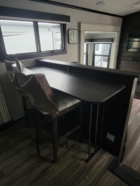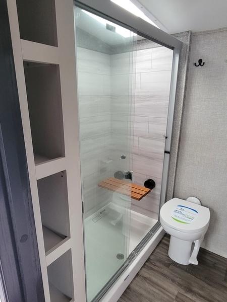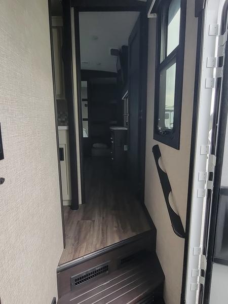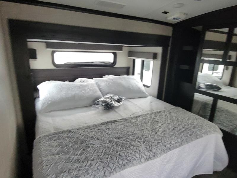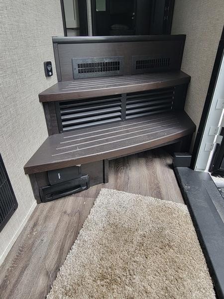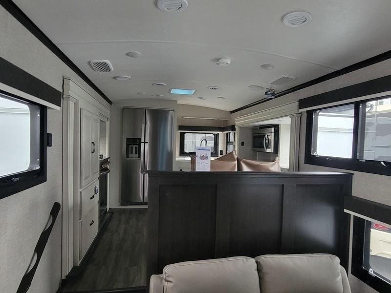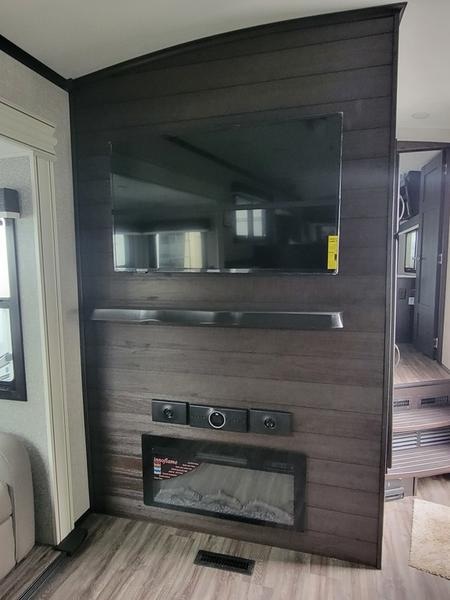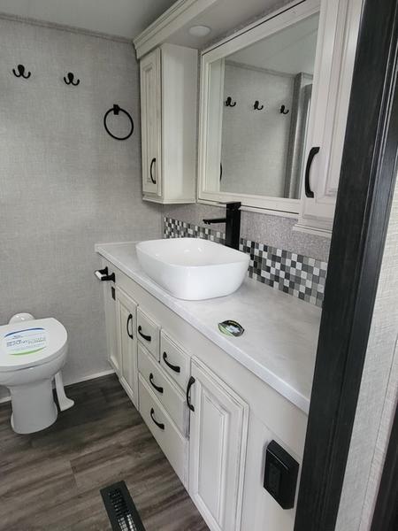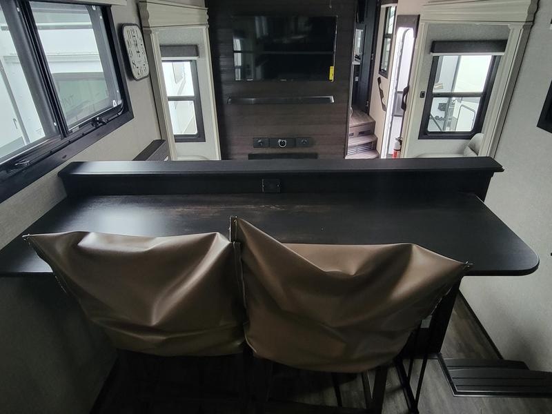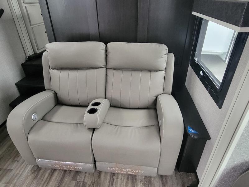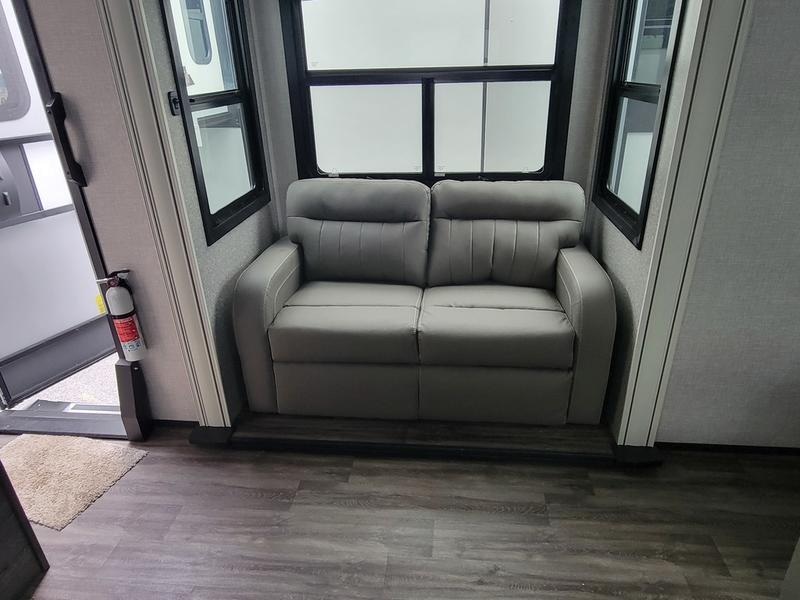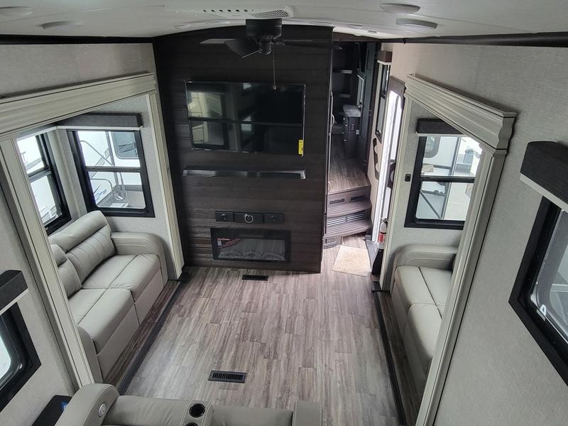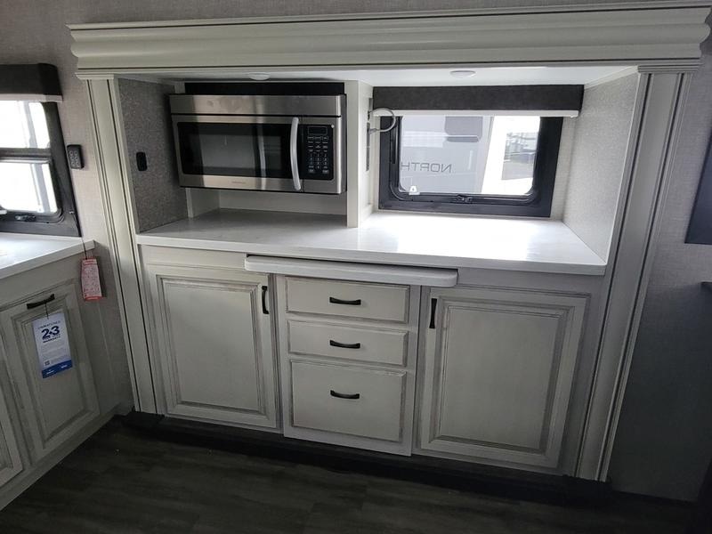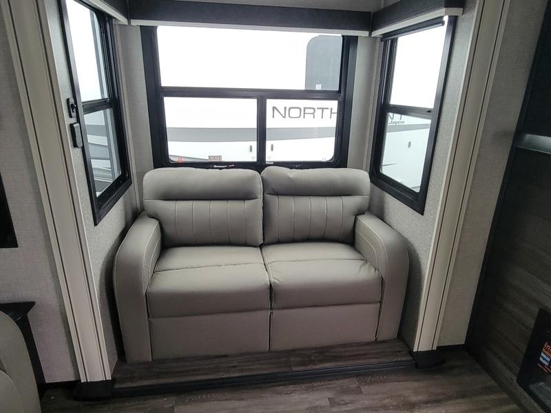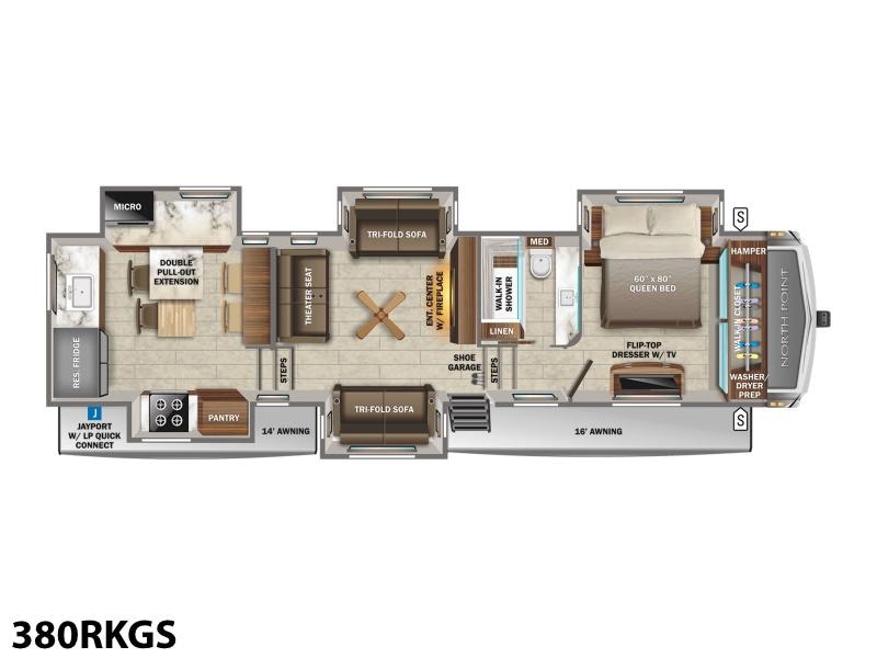 2023 Jayco North Point 380RKGS It’s the little things in this full-profile fifth wheel that you won’t find in others at the same price point. Like the new wooden pull-out spice rack and door with strut above the microwave. A new 24”x24” butcher block in the kitchen that flips up as a countertop extension and new 4K Smart TVs are just a few of the small details given attention in the 2023 North Point. Enjoy three-way adjustable headrests on theatre seats and a new pop-up charger with built-in wireless charger in the dining area for even more convenience and added comfort. Features may include: Exterior 12 in. structural steel I-beam with 10 in. steel drop frame Stronghold VBL™ aluminum framed and vacuum bond laminated gelcoated fiberglass exterior walls (including rear wall and slide room end walls) Magnum Truss™ XL6™ Roof System (strongest tested roof in the industry) with one-piece, seamless roof material with a 20 year warranty Climate Shield™ zero-degree tested weather protection: Fully-enclosed and heated underbelly (ducted) 40,000 BTU output furnace Double layer fiberglass batt insulation (roof and floor) PEX plumbing, 2 in. block foam and reflective foil JaySMART™ (Safety Markers And Reverse Travel) LED lighting (patented) Painted fiberglass front cap with double clear coat and built-in specialty LED lighting Frameless, dark tinted, safety-glass windows Custom automotive-grade vinyl exterior graphics package Skirt metal enclosed drop frame LED exterior lighting package Dual 30 lb. propane bottles with auto regulator Doorside compartment framed and vented for third propane bottle Pass-through storage with Slam-latch™ baggage doors Digital TV antenna with Wi-Fi extender Exterior marine-grade speakers Fully enclosed, universal docking center: Selectable water connections Quick-connect outside shower Black tank flush Winterization and sanitation Independent satellite wiring Interior Solid hardwood slide fascia Handcrafted hardwood glazed doors and drawers 5/8 in. tongue-and-groove joined plywood floor decking Vinyl flooring (made in the USA) throughout (includes slideout floors) Ceiling fan (select models) LED interior lighting throughout LED accent lighting above slideouts Tri-fold hide-a-bed sofa with residential sleep surface (select models) Dual USB charging ports throughout “Shoe garage” in hallway step (select models) Flip-up tabletop storage next to tri-fold sofa (select models) JayVoice voice command system- controls lighting, A/C and furnace Soft close, heavy-duty, 75 lb. full-extension, steel ball-bearing drawer guides Stainless steel kitchen sink Pull-out spice rack above microwave (select models) Residential-grade, pull-out kitchen faucet Extra 120V power outlets in kitchen and slide rooms Flip-up countertop extension with 24 in. x 24 in. butcher block bar top (select models) Pull-out utility drawer under kitchen sink Toe kick nightlights in bedroom and bathroom Residential quilted bedspread and pillows Gas-strutted under-bed storage P.A.P. prepped bedroom (includes 120V outlets and night stands with cup holders)