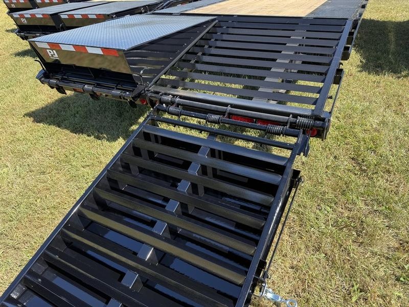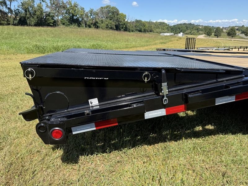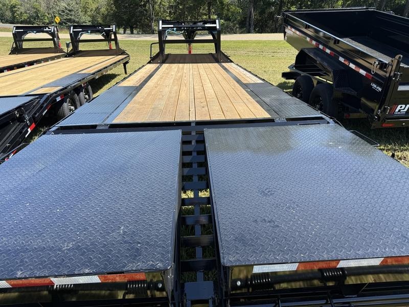 LS: Low-Pro Flatdeck with 2 Single Axles 2-5/16" Square Demco (30,000lb.) Gooseneck Coupler 25' Deck Length (With Dovetail) (2) 7,000# Electric / Spring Brake axles 5' Dovetail w/ 2 Flip-over Monster Ramps Primer + Black Powder Coat