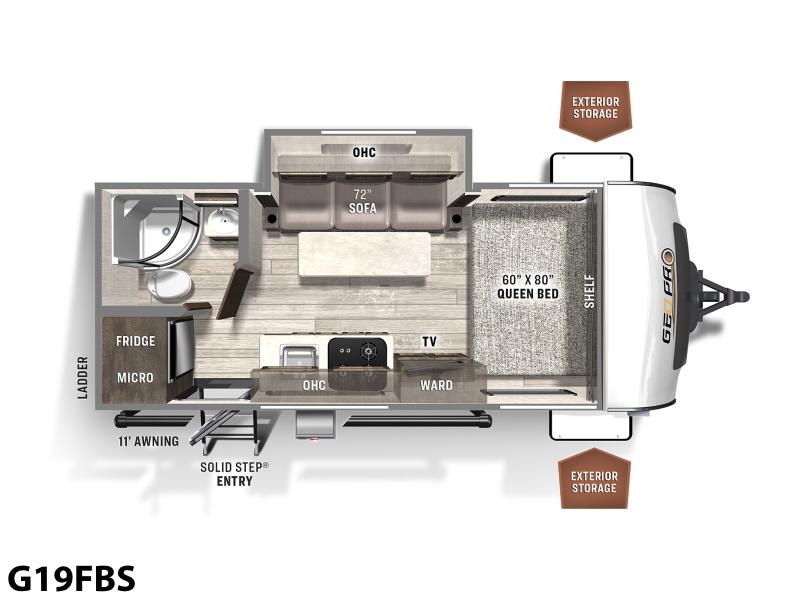 2022 Forest River Rockwood Geo Pro G19FBS THE FLOOR PLAN YOU WANT IN THE SIZE YOU NEED. We have custom designed our trailers with the best in style and amenities while keeping your towing needs in mind. Modern, fresh interiors will almost make you forget you are in the great outdoors. Quality craftsmanship and attention to detail have been put into our Geo Pro travel trailers, all with you in mind. The Rockwood Geo Pro 19FBS is a rear entry couples coach with a small slide that offers so much great space. The large bathroom is one of the best features of this small couples coach. The 72” pull-out sofa also makes for a great bed for guests, children or pets. At 20’ and 3075lb, you will not be able to get more walk around footage than this great couples coach. Features may include: Interior 13,500 Roof A/C AM/FM Stereo w/ Bluetooth and USB 12 Volt TV w/ DVD Player Roller Shades 20,000 BTU Furnace Recessed Cooktop w/ Flush Mount Cover 12V Refrigerator Microwave Maxxair® Ventilation Fan and Vent Cover Quick Recovery Gas/Electric Water Heater Shower Miser Water Saver Black Tank Flush 360 Siphon Cap on Black Tank Foot Flush Toilets Exterior 4 Frame Mounted Stabilizer Jacks Fold Out Entry Steps Roof Ladder Magnetic Baggage Door Catches Outside Shower Front Windshield Teton All In One Wi-Fi Booster/LTE Prep & Antenna Outside Griddle with LP Hookup (2) 20 lbs. LP Tanks Ground Solar Prep Outside Speaker 190 Watt Roof Mount Solar Panel w/ 1000 Watt Inverter Power Awning Polished Alloy Wheels Tinted Bonded Frameless Windows Heated Holding Tanks