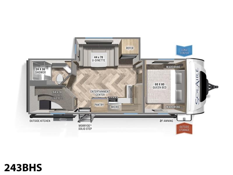 2023 Palomino SolAire Ultra Lite 243BHS SolAire Ultra Lite Travel Trailers The Ultra Lites are the results of superior design and modernization. Striving to meet all the customer’s demand this trailer provides a smooth ride with independent suspension axles, aluminum superstructure frame for light weight towing and barreled ceilings for a more spacious interior. Features may include: Power Awning w/LED Lights Dexter Tor-Flex Torsion Axles Furrion HDMI DVD/Bluetooth/HDMI Stereo Power Tongue Jack 13,500 BTU Ducted A/C Tub Surround w/Skylight Ball Bearing Drawer Guides Microwave Slam Latch Baggage Doors w/Magnets Black Tank Flush Solid surface counter tops Stainless Steel kitchen sink with roll cover Aluminum wheels 2/3 Front Fiberglass Cap (Windshield Included on All Except 304, 318, 320) LED Interior Lighting White Hi Gloss Exterior USB Ports Roller Shades 11 cubic foot Refrigerator Tire Pressure Monitoring System Glass Top Flush Mount Range Maxx Air Vent (Bathroom)